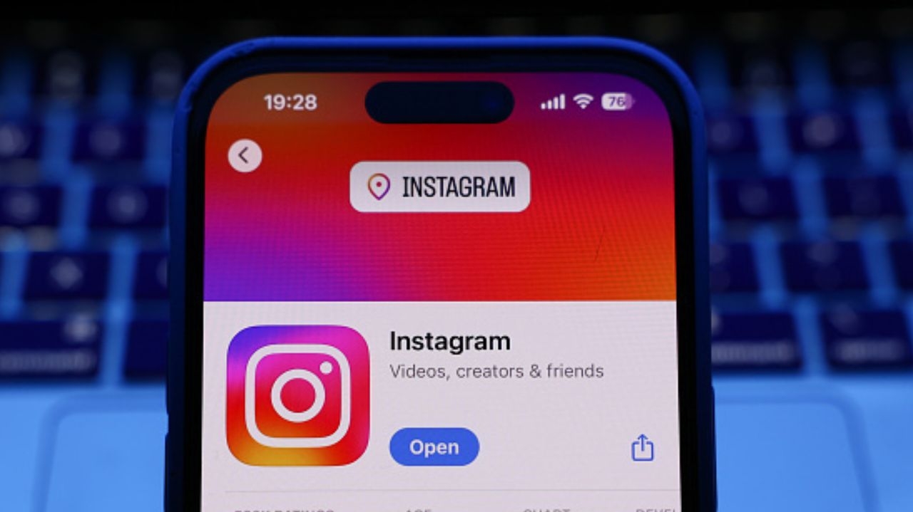 Foto Destaque: o Instagram na App Store é mostrado na tela de um telefone, enquanto ao fundo aparece um teclado (Reprodução/Jakub Porzycki/NurPhoto/Getty Images Embed)
