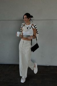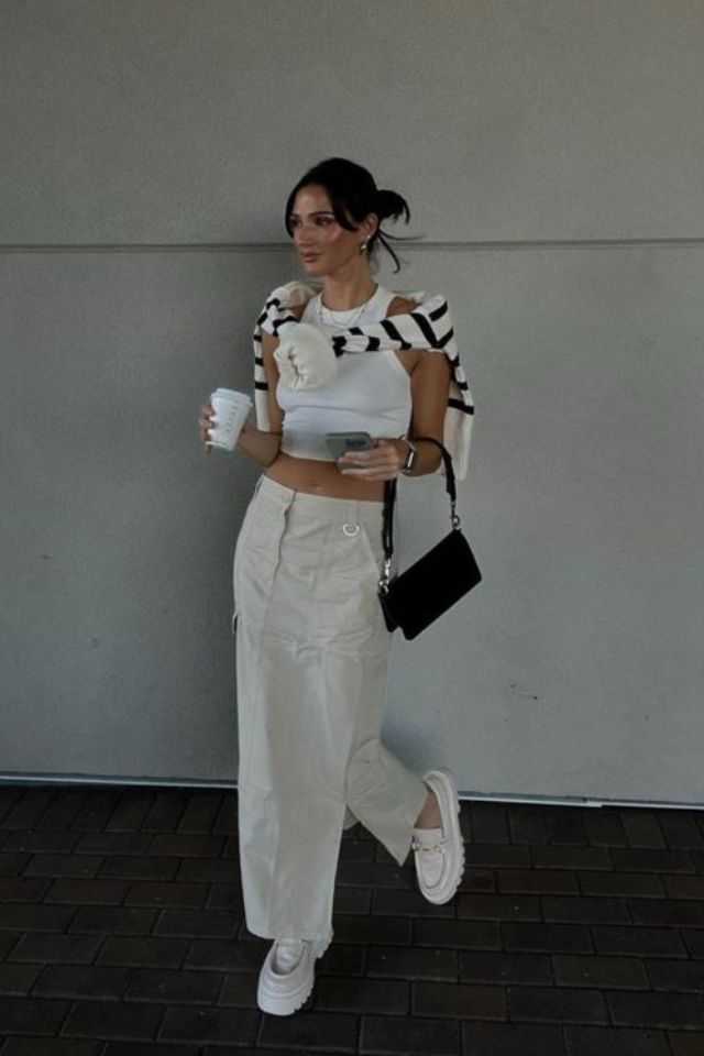Para produções cotidianas, a saia cargo funciona como peça base para looks descontraídos. Aposte em camisetas básicas, regatas de malha ou blusas justas. O contraste entre o corte utilitário da saia e peças mais ajustadas cria um equilíbrio moderno e despojado.