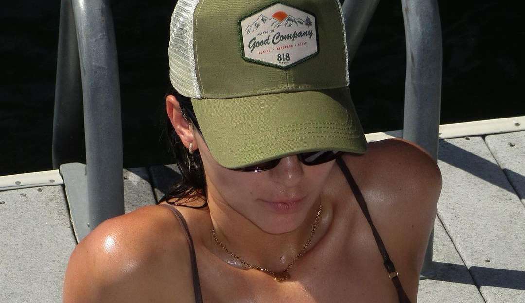 Na série de três fotos que postou, Kendall compartilhou sua boa forma vestindo um traje de banho bem pequeno e um boné também da marca “Tequila 818”, que faz parte da nova coleção de verão lançada recentemente.