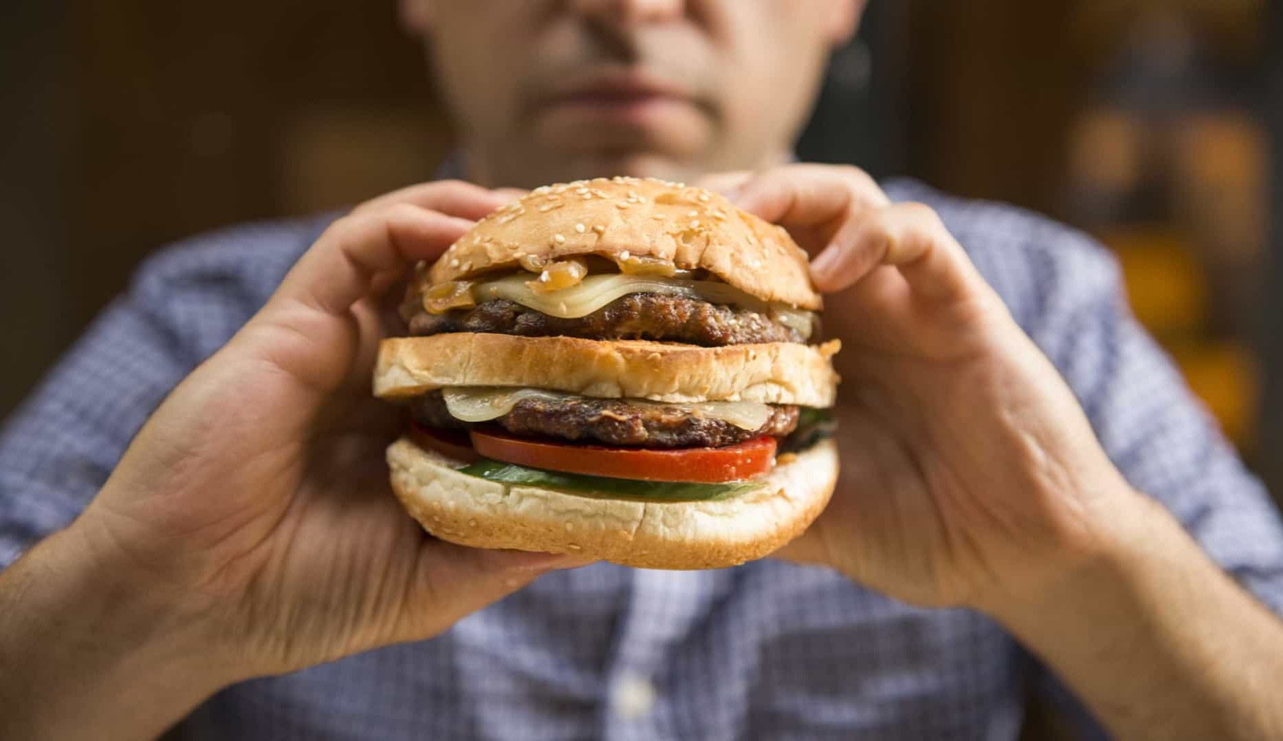 Foto destaque: Pessoa comendo um X-Burguer. Reprodução/Divulgação