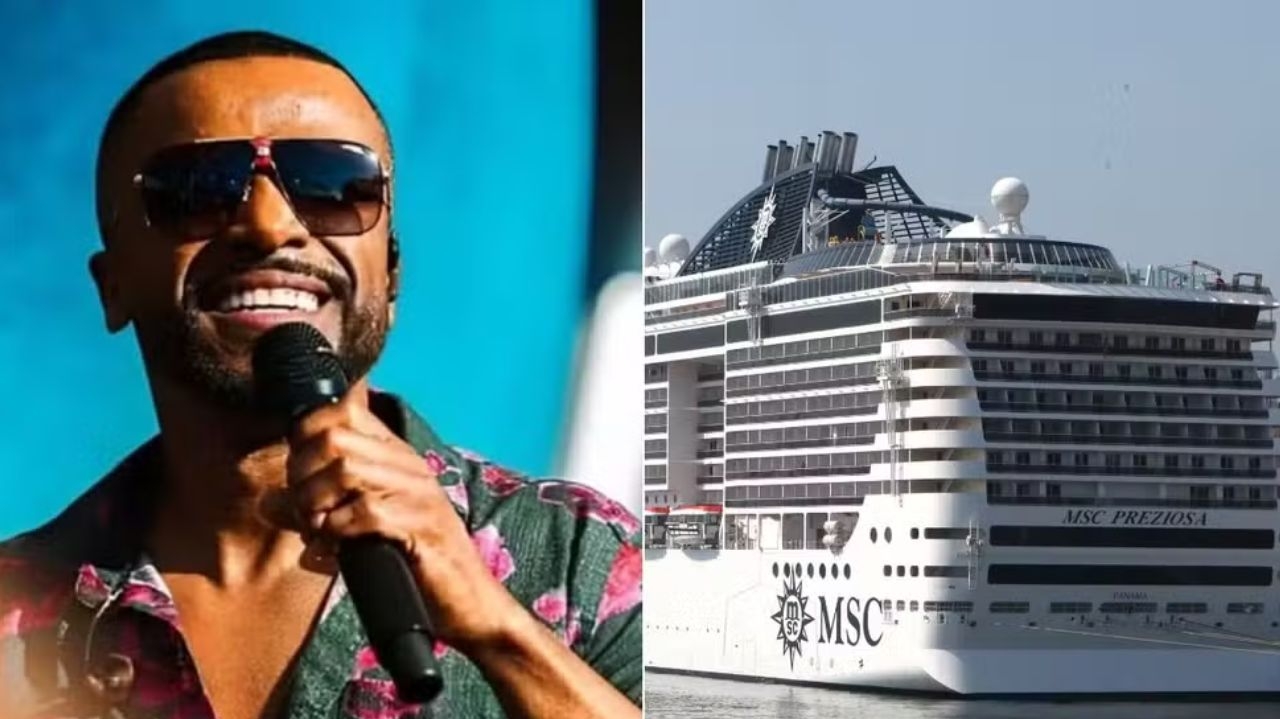 Foto destaque: Alexandre Pires e o navio MSC Preziosa (Reprodução/ Sílvio Luiz/A Tribuna Jornal)