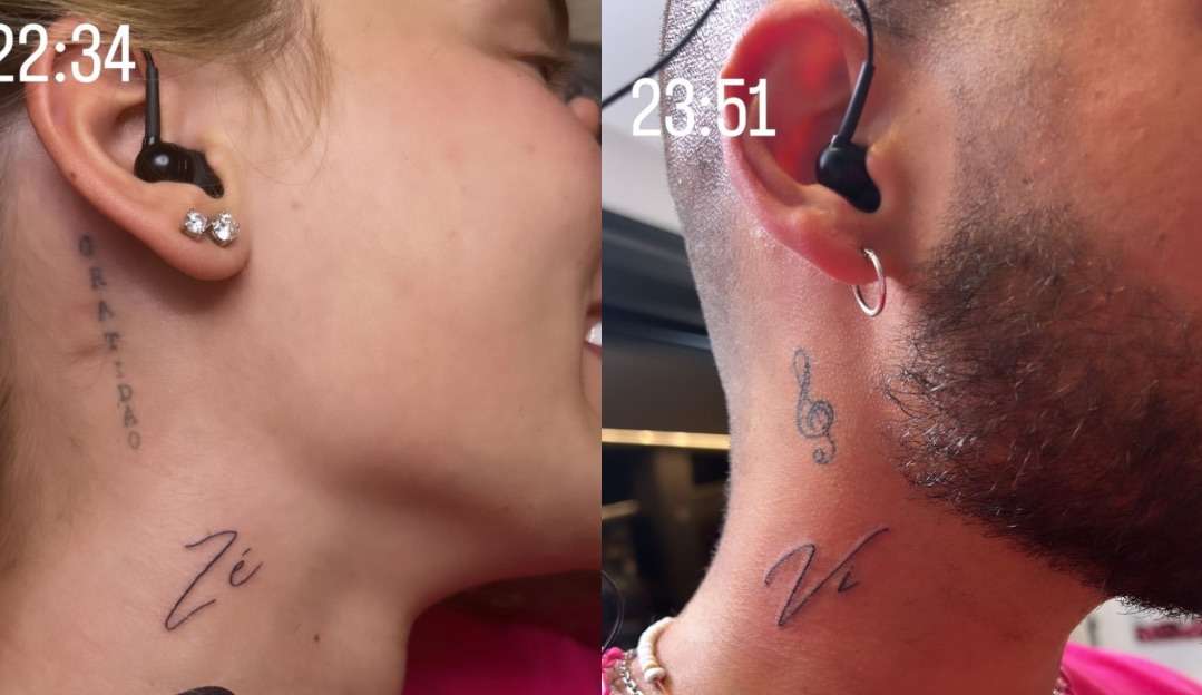 Virginia Fonseca e Zé Felipe aproveitaram o fim de semana para fazer uma nova declaração amorosa, dessa vez, permanente. Neste sábado (14), a influencer tatuou “Zé” e o cantor escreveu “Vi”, ambos no pescoço. A empresária compartilhou a novidade com os seguidores em seu Stories do Instagram.