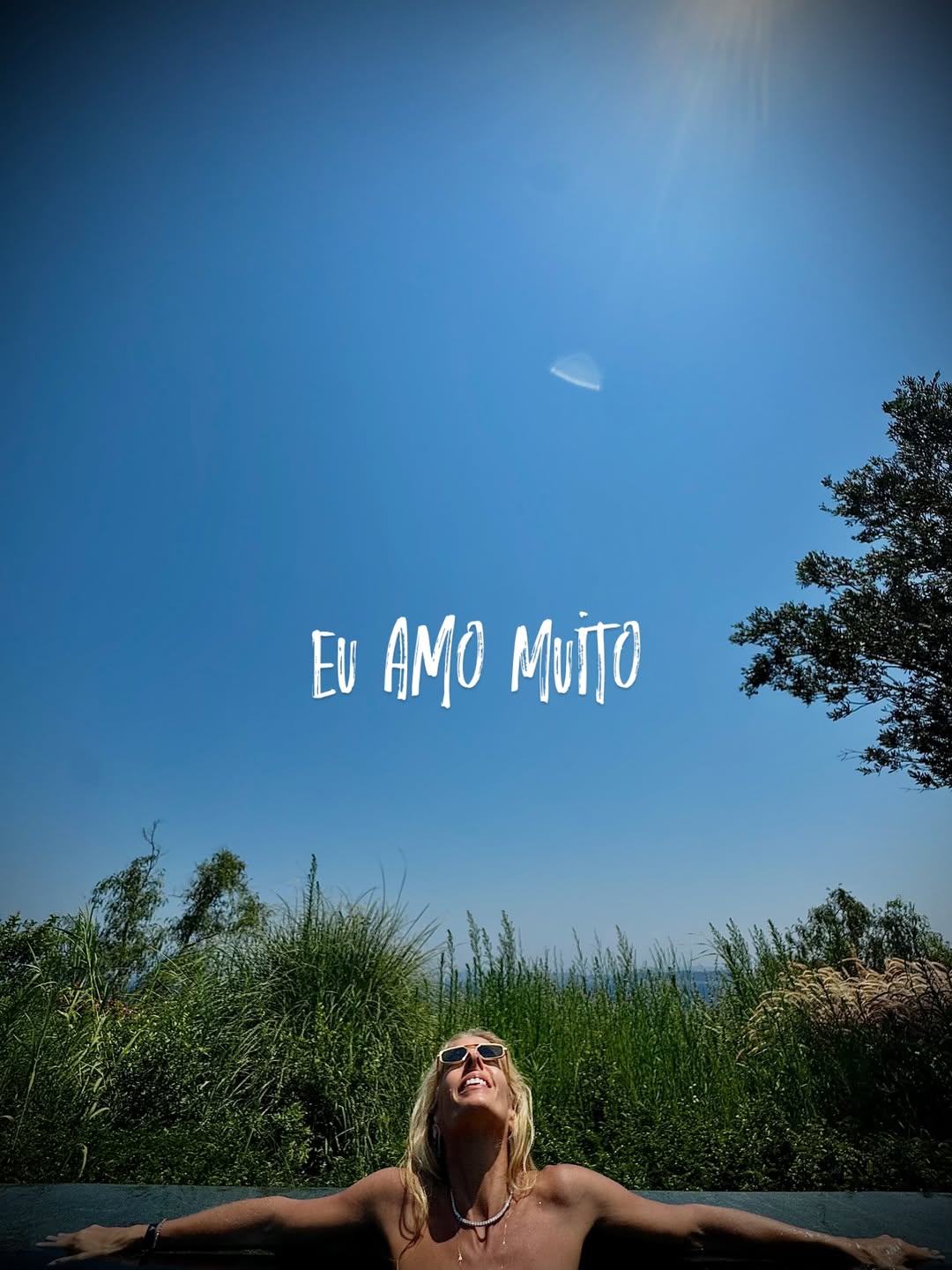 A apresentadora, de 52 anos, escreveu um “Bom dia” e, em seguida, postou outra foto, dessa vez dentro da piscina, mas cortou os seios no enquadramento da imagem.