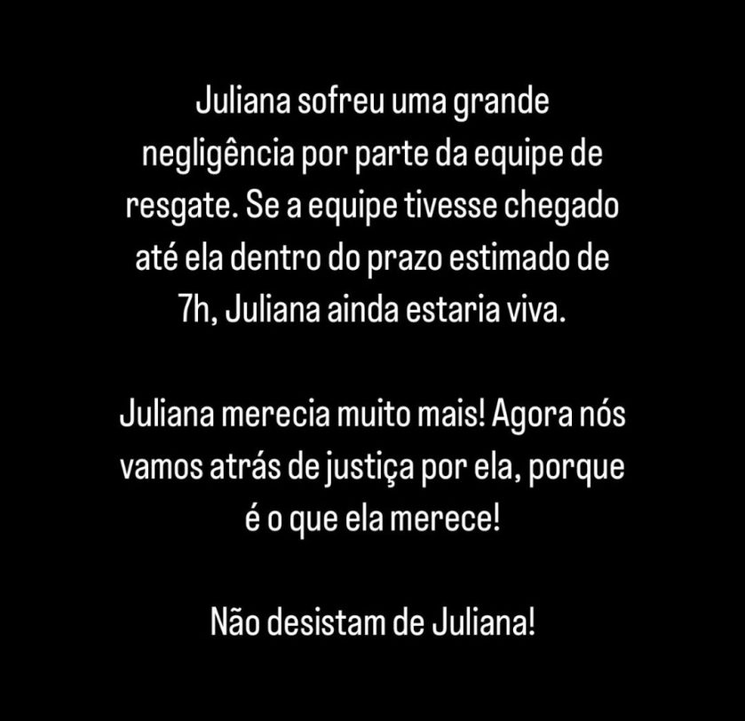 Hoje, a família anunciou, por meio do Instagram criado para divulgar informações oficiais sobre o resgate, que buscará justiça pela morte de Juliana. Eles acusam a equipe de resgate de negligência e afirmam que ela poderia estar viva caso tivesse sido socorrida a tempo.
