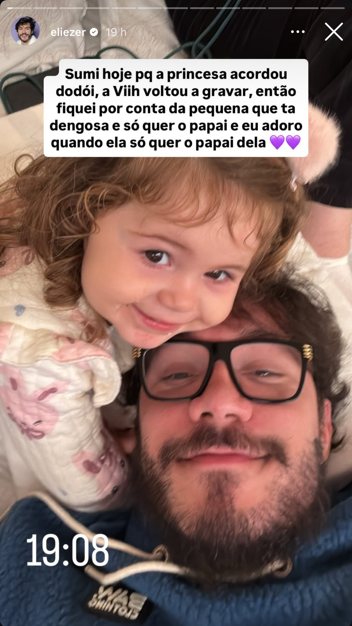 Enquanto Viih Tube retomava sua rotina de gravações após um período de recuperação de cirurgias plásticas, Eliezer ficou responsável pelos cuidados com a filha mais velha, Lua, de 2 anos. Segundo ele, a menina acordou indisposta e mais manhosa do que o habitual, buscando consolo exclusivamente nos braços do pai. “Ela só queria o colo do papai, e eu fico todo bobo quando isso acontece. É um misto de preocupação e carinho”, disse o ex-BBB, que compartilhou o momento nas redes sociais.