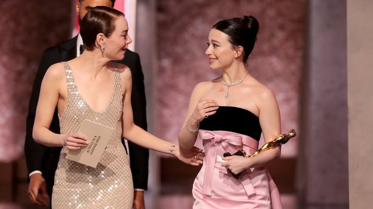Foto destaque: Mikey Madison recebe o prêmio de melhor atriz de Emma Stone, vencedora do ano anterior (Reprodução/Instagram/Al Seib/@theacademy)