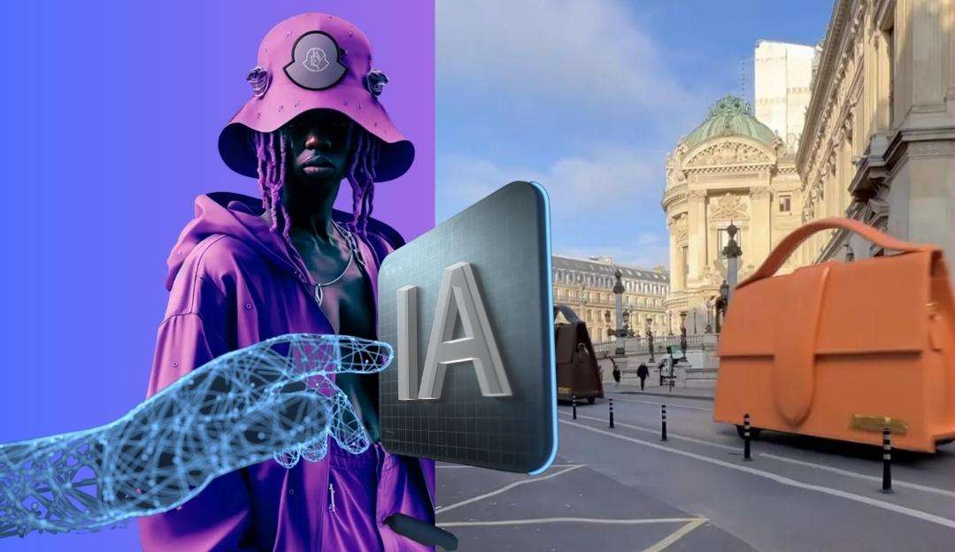 Foto destaque: (à direita) imagem gerada por IA da Maison Meta (Foto: Divulgação/Moncler)/ (à esquerda) bolsas das Jacquemus nas ruas de Paris. (Foto: Reprodução/ Getty Images)/ Edição: Canva.