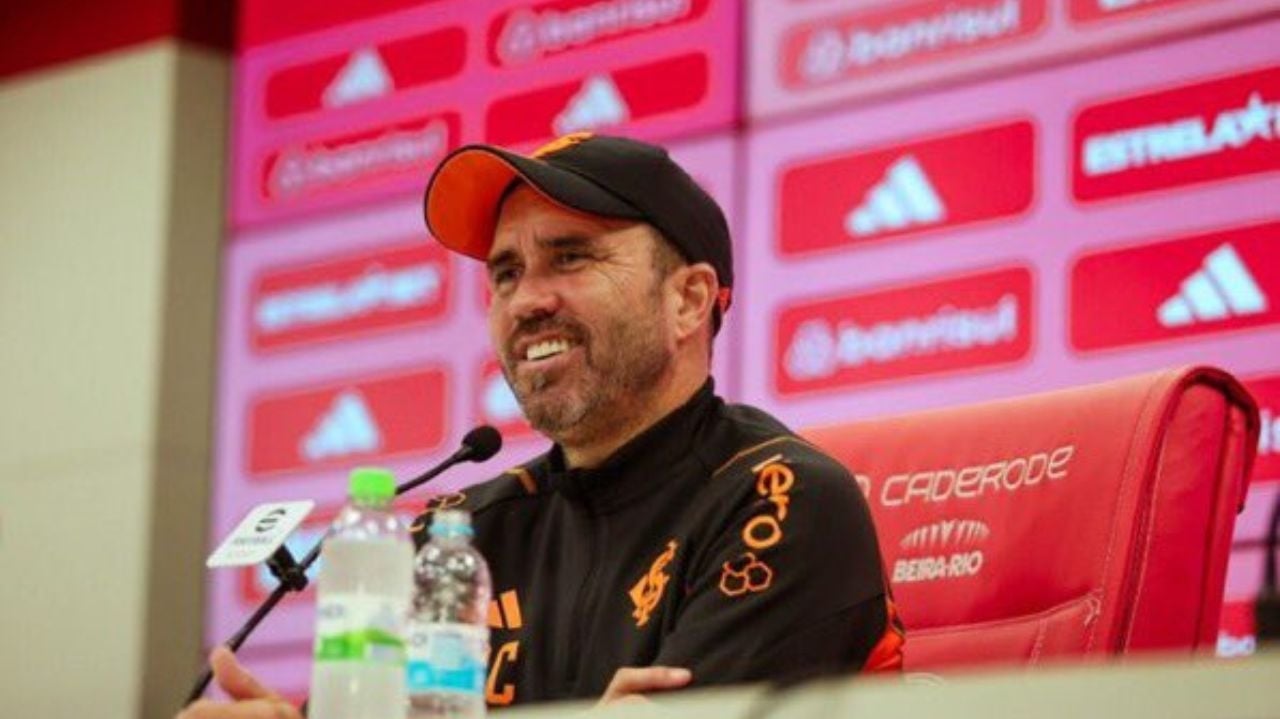 Foto destaque: Eduardo Coudet, técnico do Internacional, em entrevista coletiva pós-jogo (Foto: reprodução/X: @InterTimeLine)