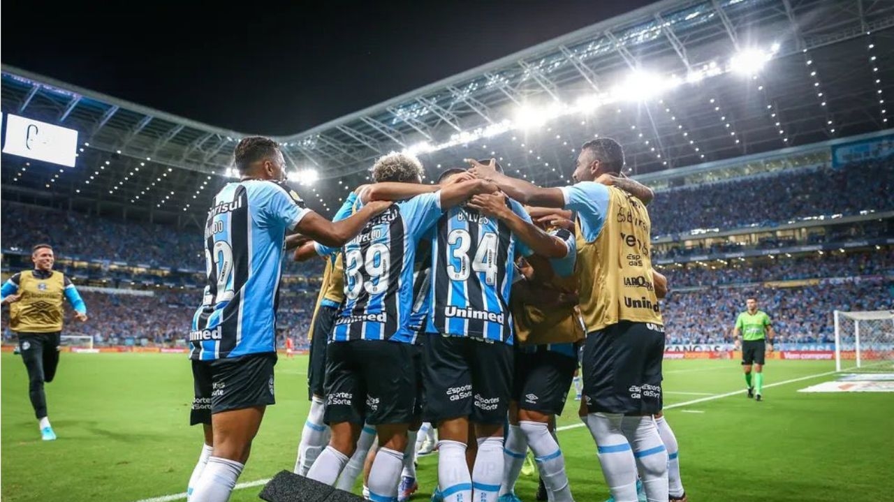 Foto Destaque: jogadores do Grêmio comemoram a vitória. Reprodução/Twitter/Lucas Uebel