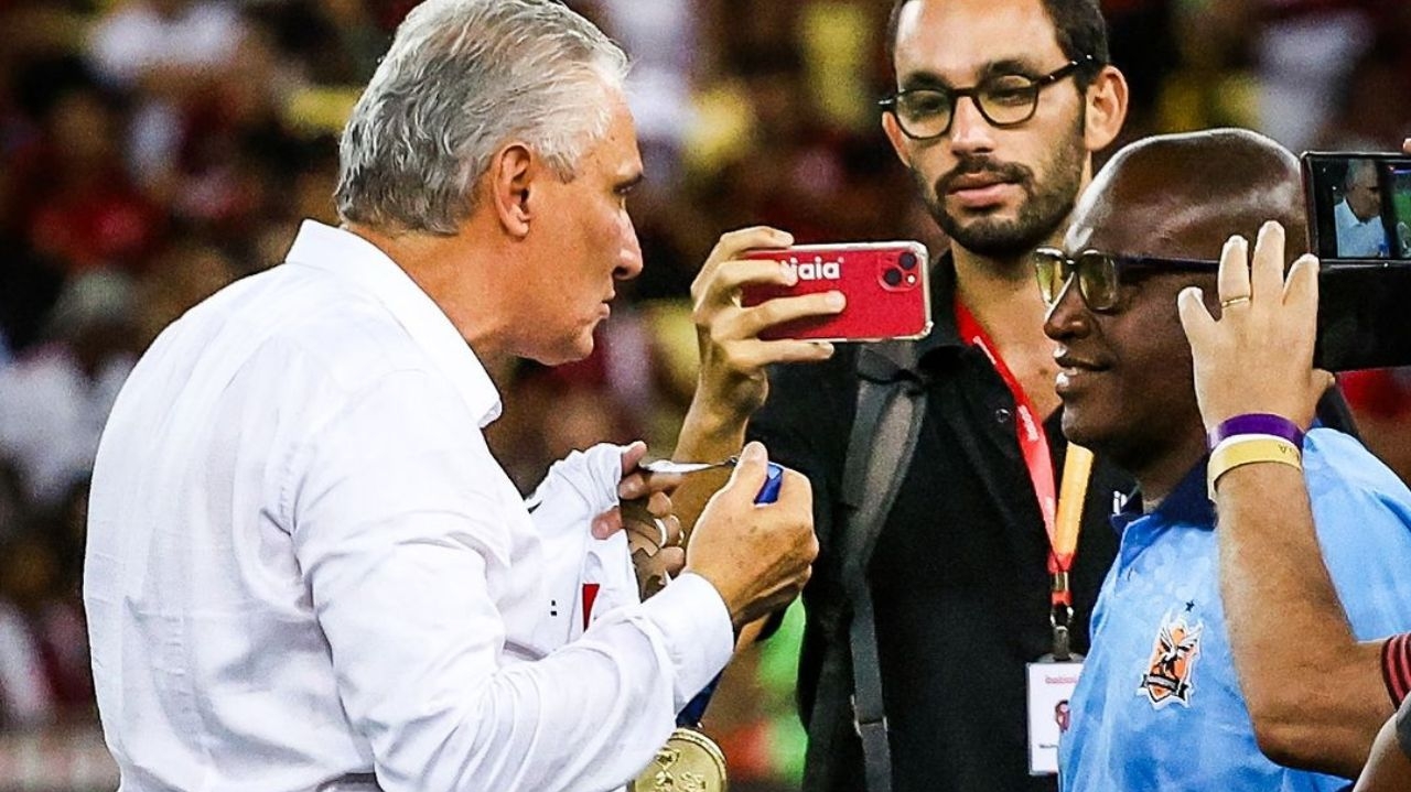 Foto Destaque: Técnico Tite entregando sua medalha para Carlos Vitor (Reprodução/Rafael Arantes/Instagram/@maracana)