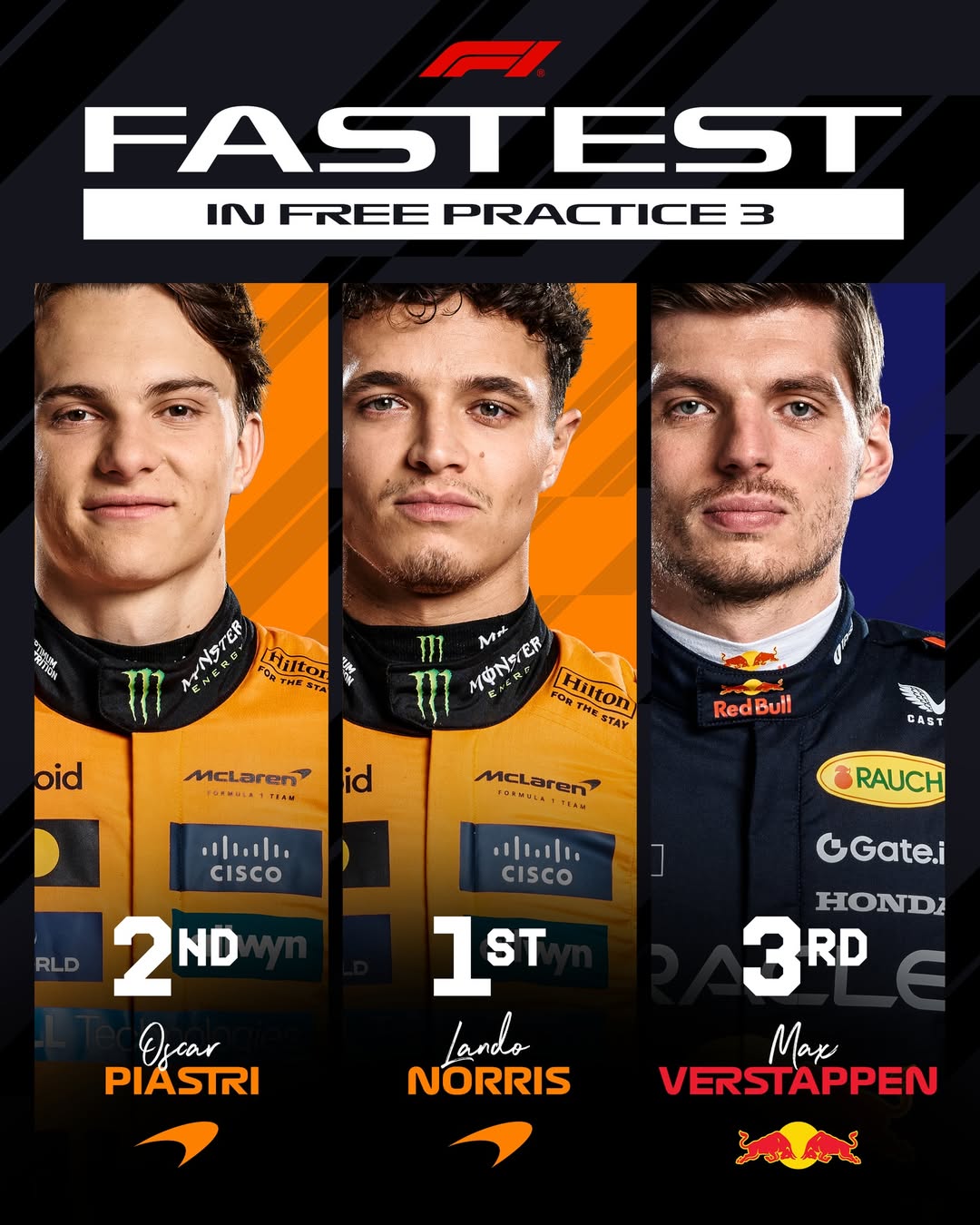 Norris marcou 1min04s324, superando o companheiro australiano por 0s118. Max Verstappen terminou em terceiro, 0s210 atrás do líder, mesmo passando boa parte do treino nos boxes — a Red Bull precisou reparar o assoalho de seu carro após um dano no início da atividade. Nos instantes finais, o holandês ainda rodou na entrada da reta principal.