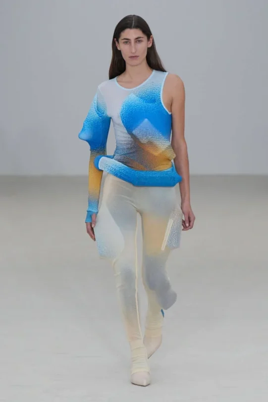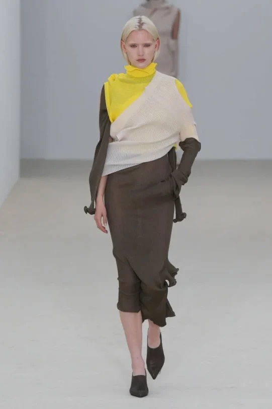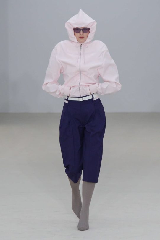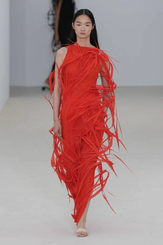 Transparências e sobreposição de várias peças em um único look também chamaram atenção. Além disso, cores vibrantes apareceram em um cenário todo branco, destacando as roupas e mostrando a mistura entre estrutura e liberdade na coleção.