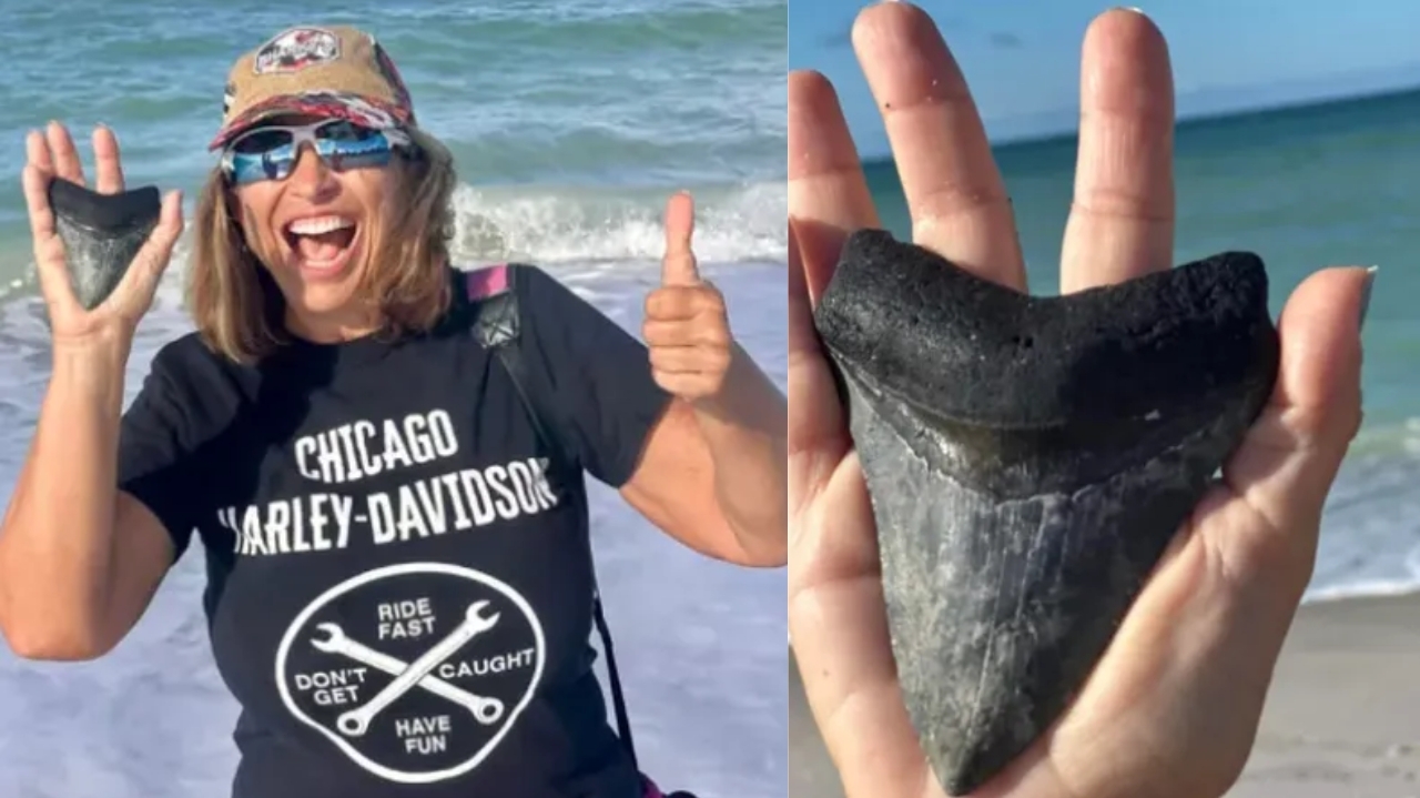 A aposentada Beth Orticelli fez uma descoberta impressionante durante um passeio na praia de Venice, na Flórida. Ela encontrou um dente de megalodonte, um tubarão pré-histórico que dominou os oceanos entre 2,6 e 20 milhões de anos atrás. O dente, do tamanho da palma da mão de Beth, é considerado uma raridade, já que a maioria dos fósseis de dentes de tubarão são encontrados no fundo do mar, não em praias.