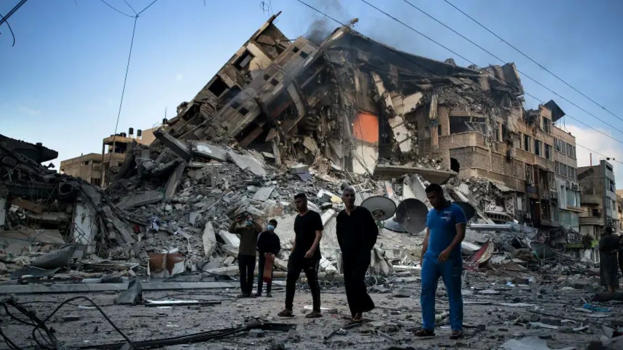 Foto Destaque: Palestinos andando perto de um prédio destruido na cidade de Gaza. (Foto: reprodução/Abdel Kareem Hana/Associated Press)