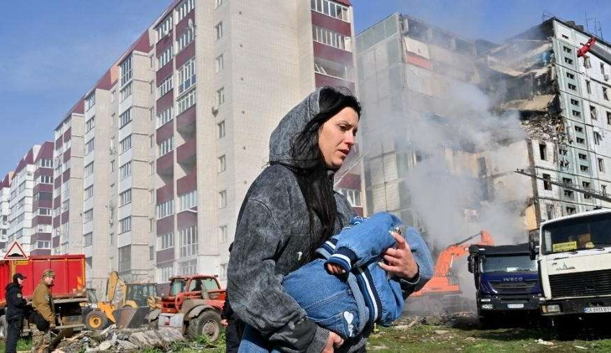 Foto destaque: Mulher carrega criança após míssil russo atingir prédio residencial em Uman, cidade a 215 km de Kiev, capital da Ucrânia. Reprodução/SERGEI SUPINSKY/AFP