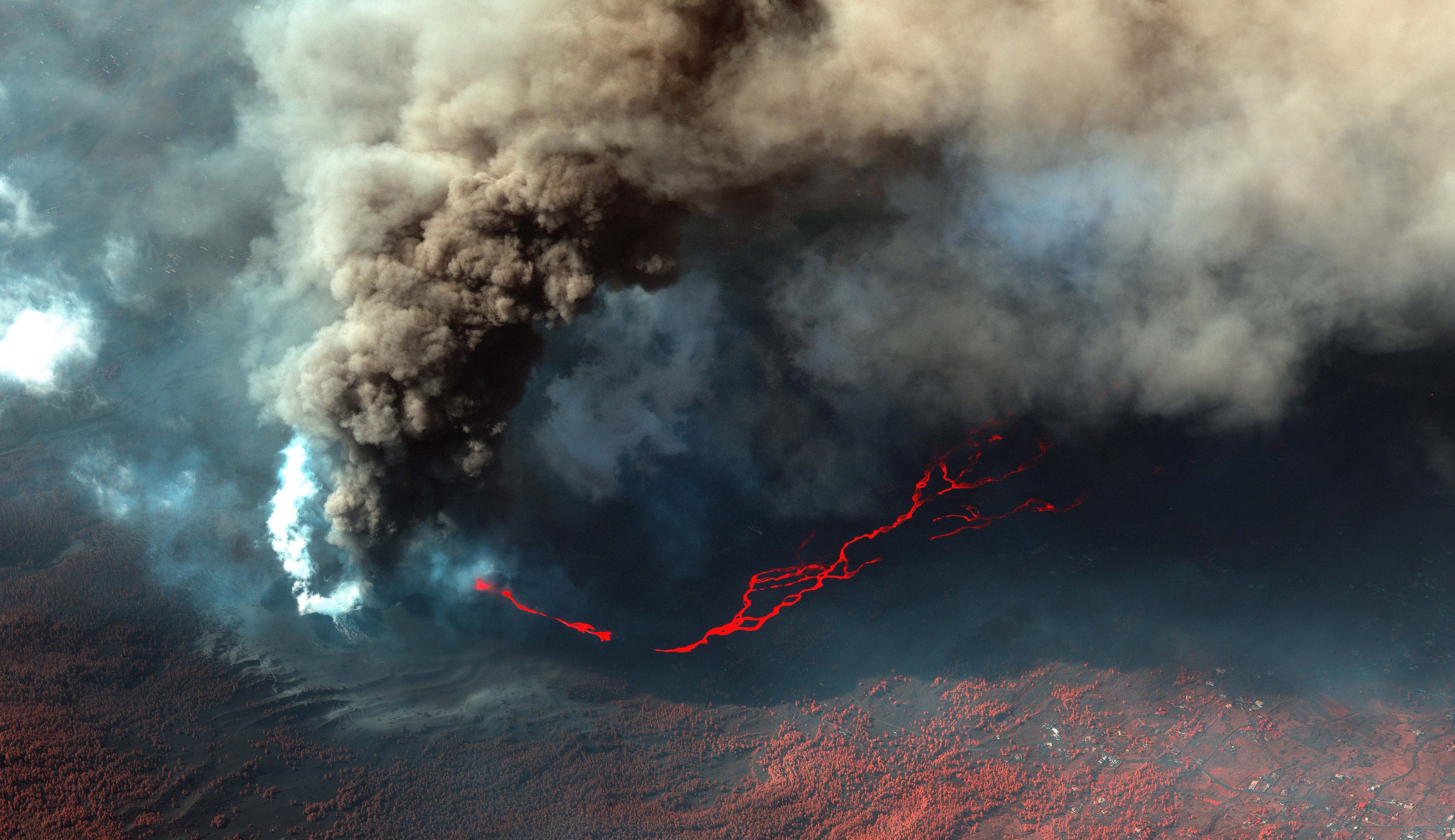 Foto destaque: Vulcão Cumbre em erupção. Reprodução/Satellite Image @2021/Maxar Technologies