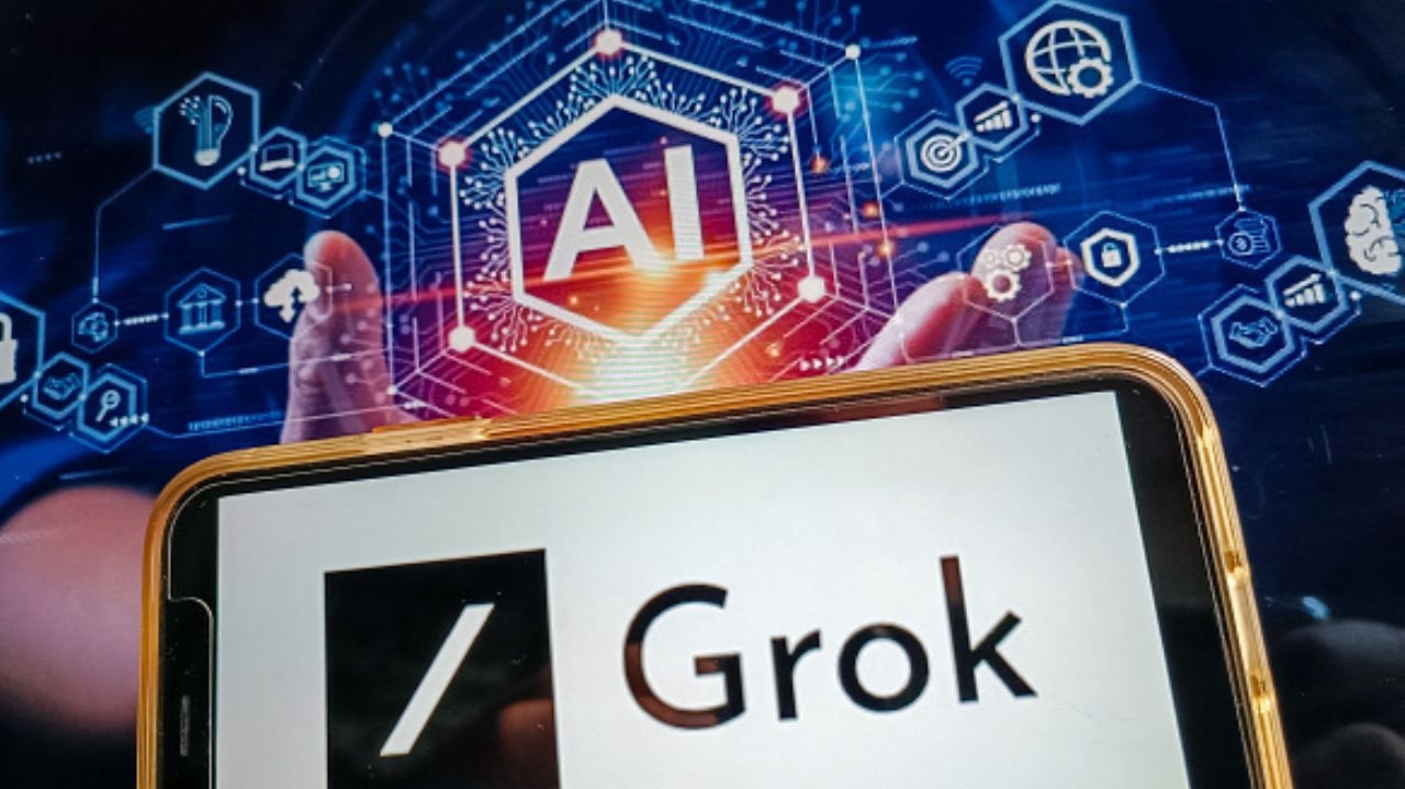Foto Destaque: logotipo da Grok é exibido na tela de um celular, atrás aparece o logo da IA (Reprodução/RICCARDO MILANI/Hans Lucas/AFP/Getty Images Embed)