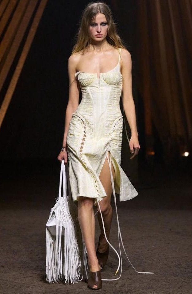 Nas coleções, o espartilho foi usado tanto em looks de festa quanto no dia a dia, coordenado com jeans, calças de alfaiataria ou sobreposições. A mensagem é clara: sensualidade e poder não precisam de exageros.